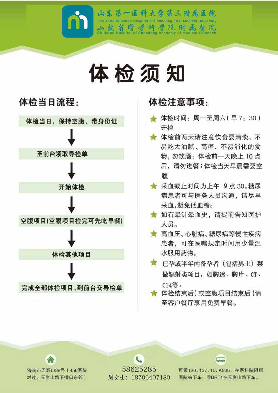(二)體檢地點:山東省醫(yī)學科學院附屬醫(yī)院體檢中心(位置:濟南市無影山38號(456醫(yī)院對面)1號樓查體中心);